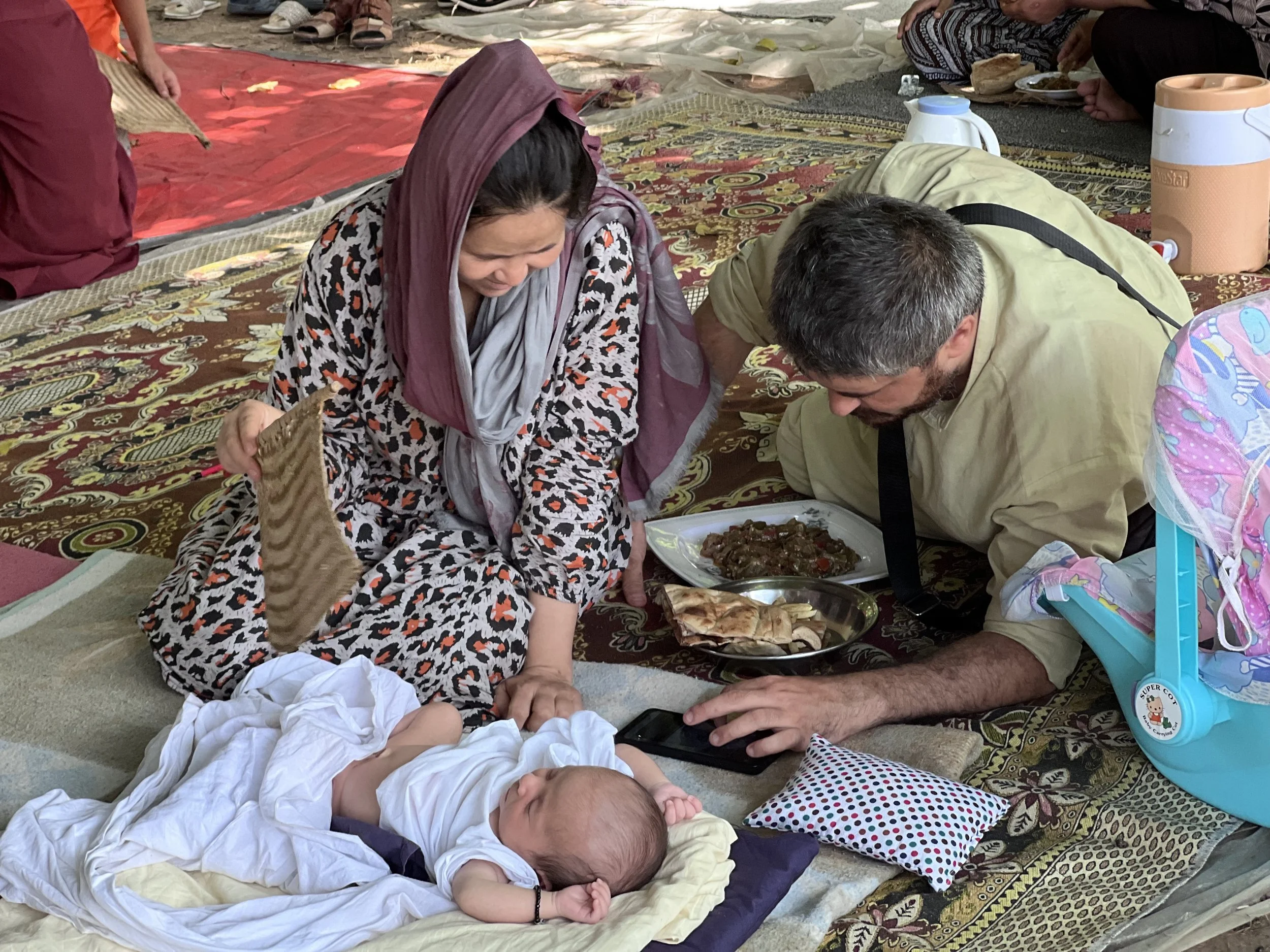 An Afghan mother and father sit in a public park in Islamabad, Pakistan, on Aug. 20, 2025, during a demonstration against the government’s deportation measures. Days earlier, after their landlord asked them to vacate the property, the family welcomed a newborn child. Photo: Jamaima Afridi for More to Her Story