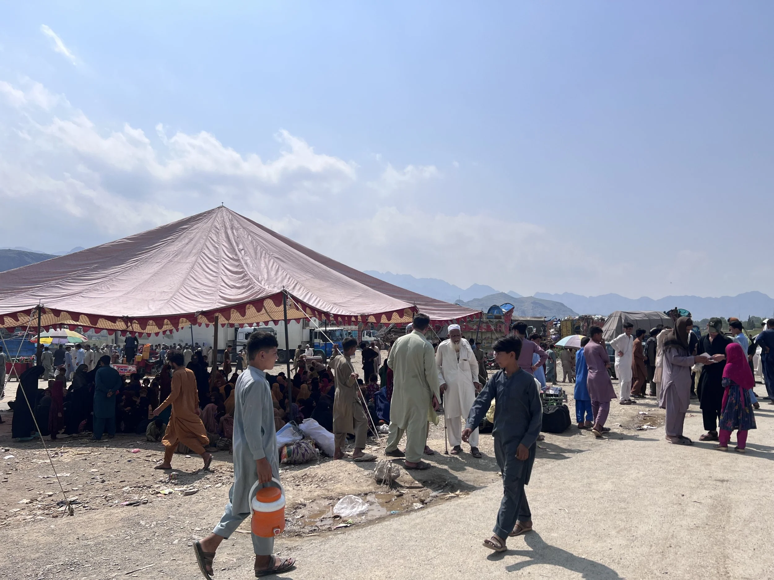Crowds gather at Landikotal camp, near the Pakistan-Afghanistan border, where temporary tents have been set up by Pakistani authorities to give shelter to families undergoing deportation processing on September 1, 2025. Families reportedly wait for as long as three to four days here. Credit: Jamaima Afridi for More to Her Story.