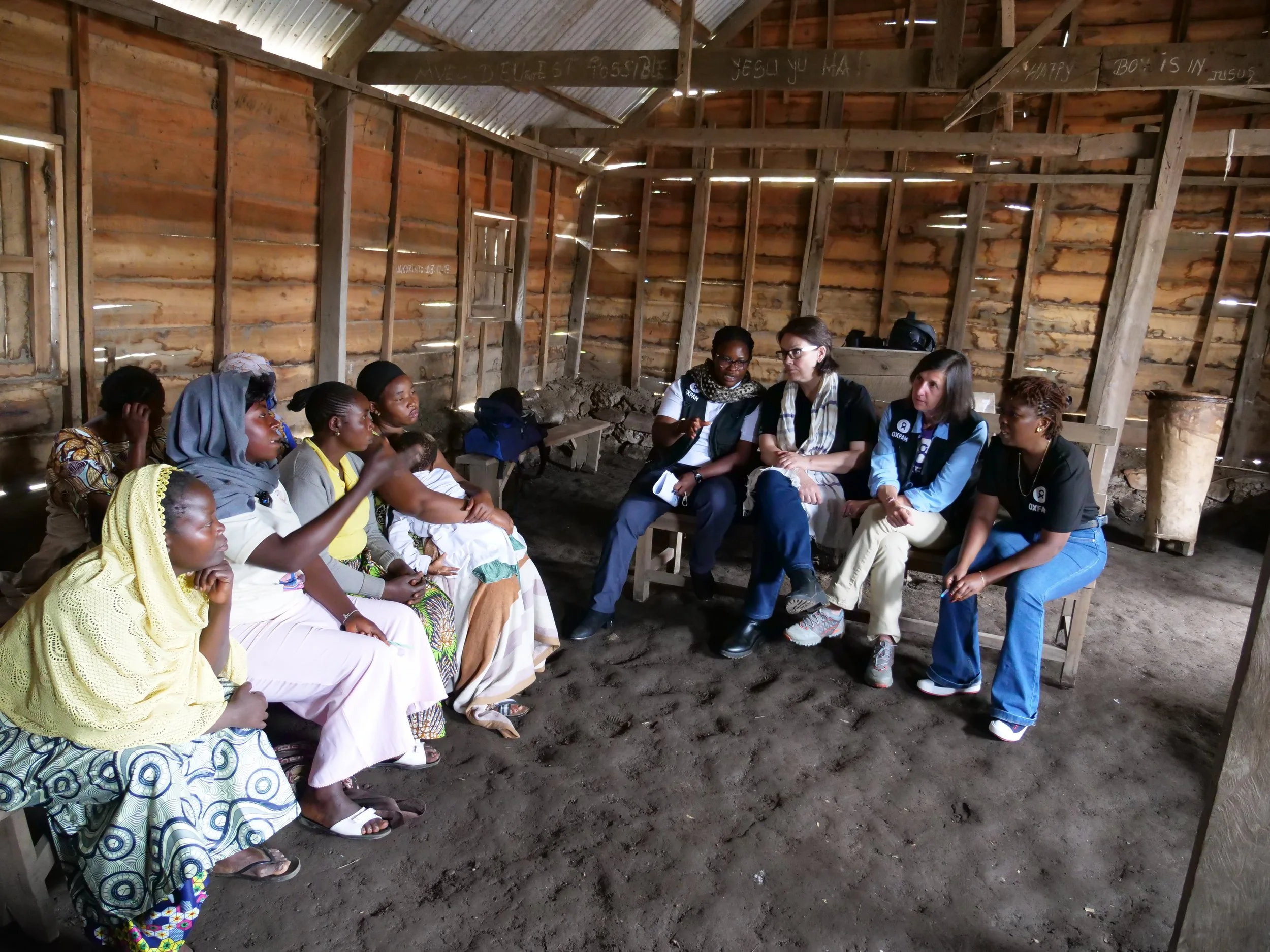 Abby Maxman and Beatrice Vaugrant meet with women from Ngumba on July 10, 2025. Pictured left to right: Kahindo Salumu Tantine, Kahindo Muhima Charline, Francine Ruyange, Chance Wabo Alice, Madeleine Cibalonza of Oxfam Goma, Béatrice Vaugrante, President of Oxfam Quebec, Abby Maxman, President of Oxfam America, and Joyce Basunga of Oxfam Goma. Credit: Oxfam America