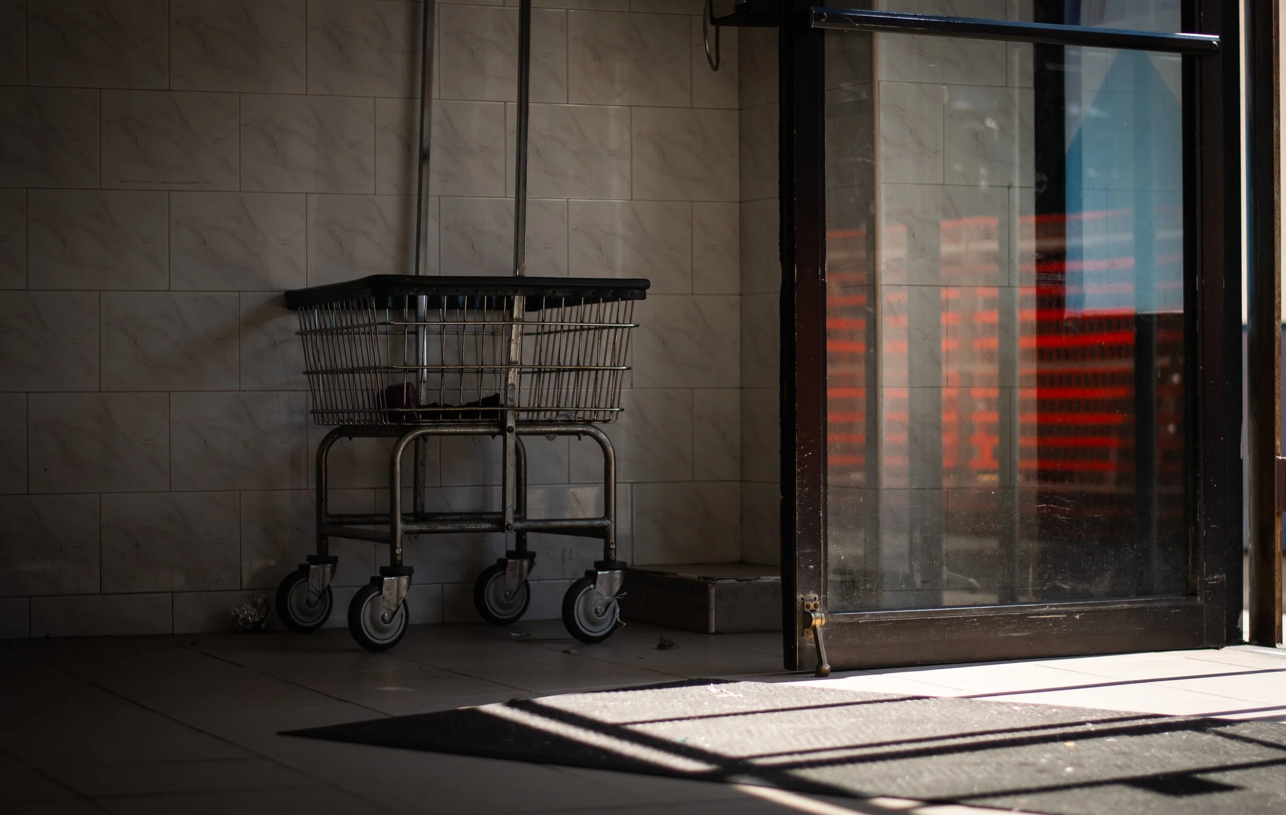 Wheeled carts are lined up in the back of a laundromat in Jamaica, NY, on July 9, 2025. / Kelly Kimball for More to Her Story.